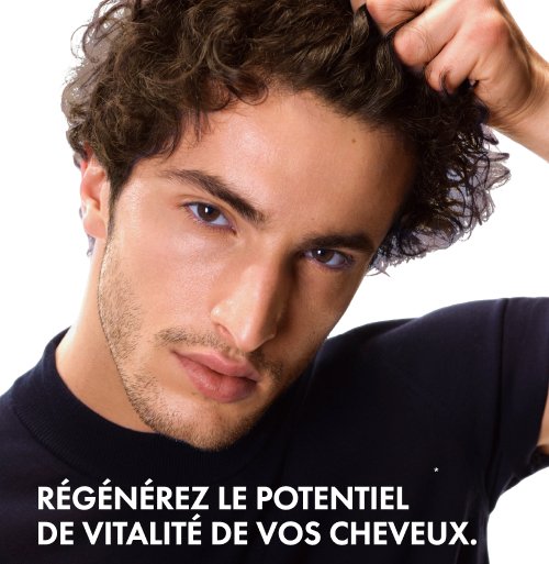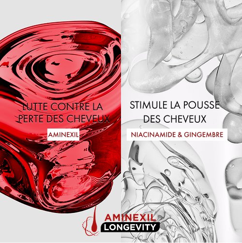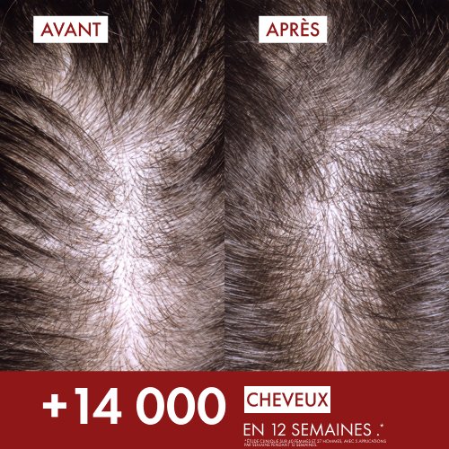 * Étude clinique sur 40 femmes et 37 hommes à raison de 5 applications par semaine durant 12 semaines. **Test instrumental. ***Test instrumental, après utilisation du shampoing Energy+ et du sérum Aminexil Clinical R.E.G.E.N. BOOSTER.